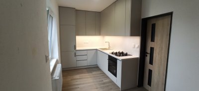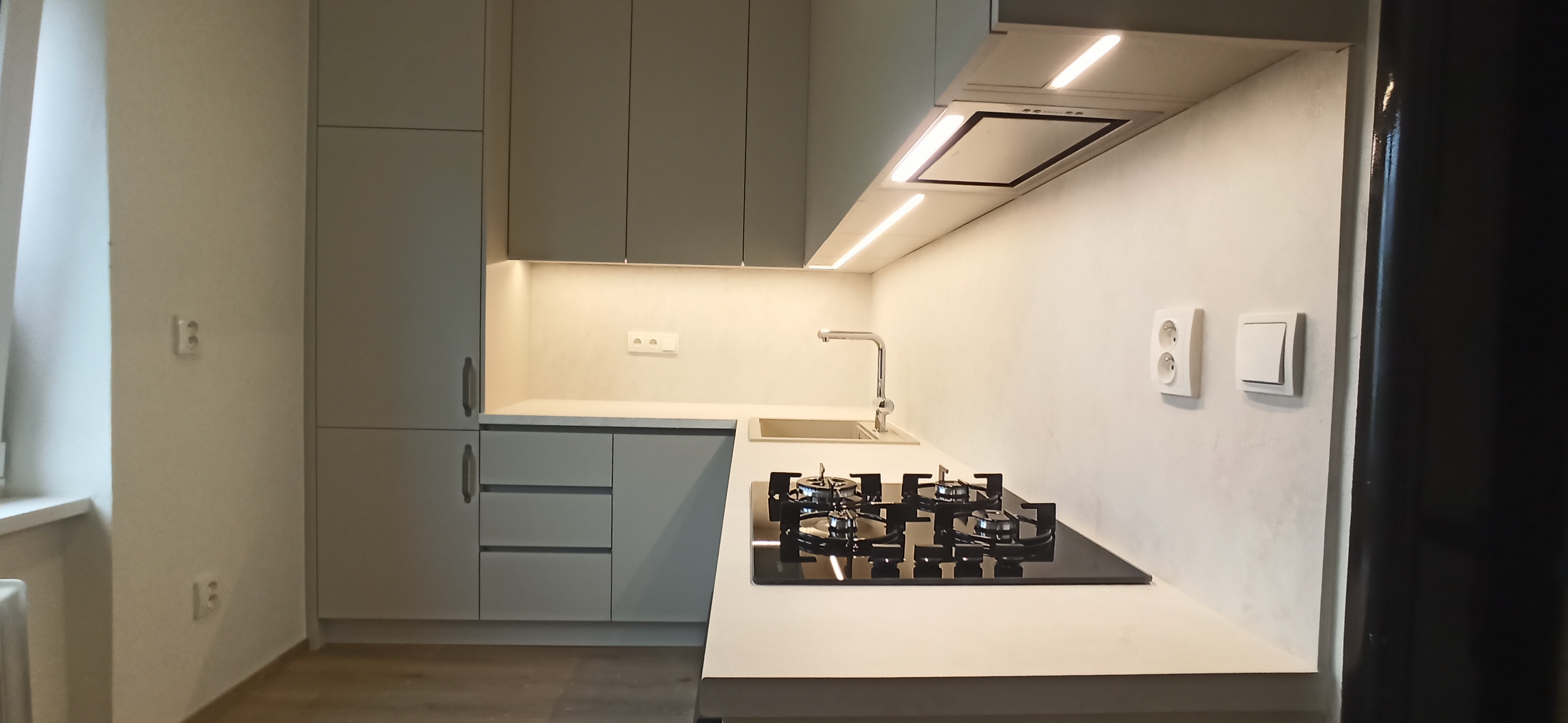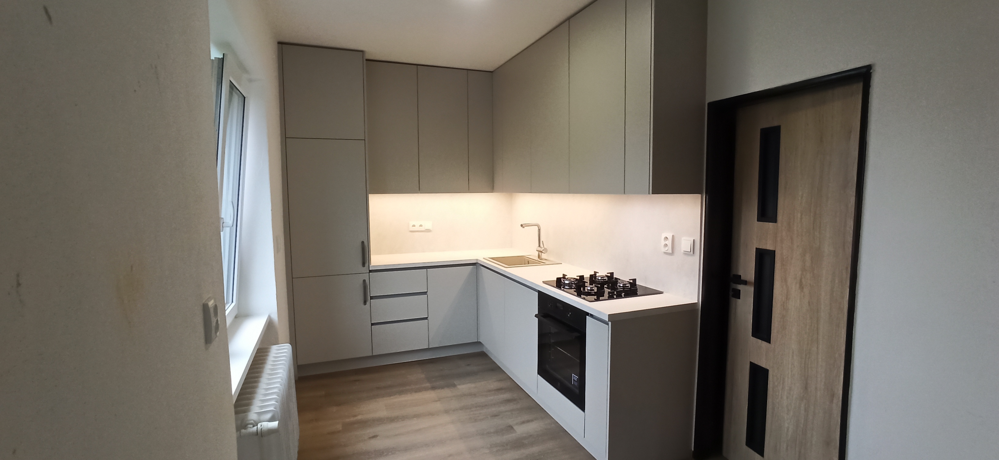 Tato elegantní kuchyňská linka byla navržena s důrazem na maximální využití prostoru a funkčnost. Kombinace světlých matných dvířek, integrovaného LED osvětlení a vestavěných spotřebičů vytváří čistý a nadčasový design. Rohová skříň je vybavena výsuvným mechanismem pro pohodlné uložení hrnců a nádobí. Ideální řešení pro menší kuchyňské prostory bez kompromisů na estetice a praktičnosti.